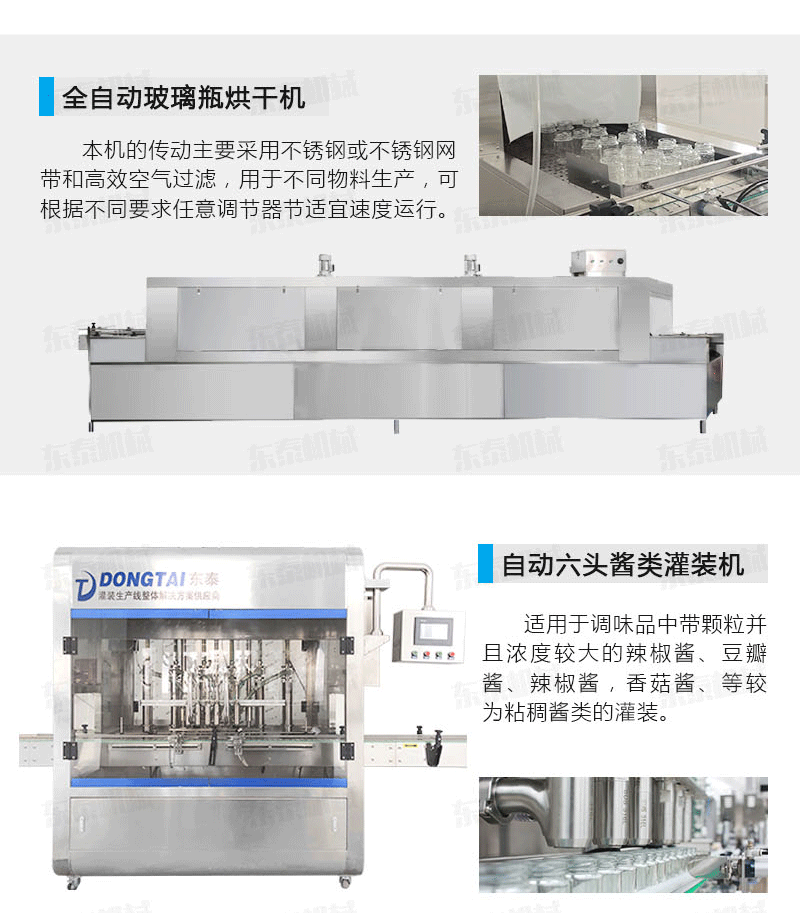 番茄醬灌裝旋蓋生產(chǎn)設(shè)備組成: 自動供瓶機+全自動滾筒洗瓶機+自動六米烘干機+自動收瓶機+全自動六頭灌裝機自動灌裝+全自動提蓋機自動理蓋、提蓋、掛蓋+六頭真空旋蓋機同時六個頭真空旋蓋+套標(biāo)機+收縮