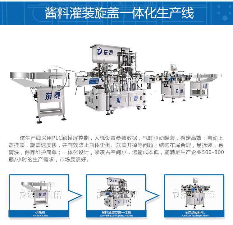 作為國(guó)內(nèi)專業(yè)的醬料灌裝機(jī)廠家,我們東泰機(jī)械能夠在市場(chǎng)中不斷實(shí)現(xiàn)創(chuàng)新和突破,是我們結(jié)合了市場(chǎng)的真實(shí)情況以及客戶的真實(shí)需求來(lái)不斷跟隨市場(chǎng)的需求和需要進(jìn)行變化,從而掌握市場(chǎng)的主動(dòng)權(quán),才致使醬料灌裝機(jī)朝著高端化、智能化的方向前行,來(lái)得到更多消費(fèi)者的好評(píng)和認(rèn)可,辣椒醬再我們生活之中已經(jīng)是屬于再熟悉不過(guò)的產(chǎn)品了,雖說(shuō)醬料的好處比較多,也可以提高食物的口味,但是你可能不知道的是,味道好的醬料也是離不開(kāi)包裝,既然有了包裝的需求自然離不開(kāi)醬料灌裝機(jī)。