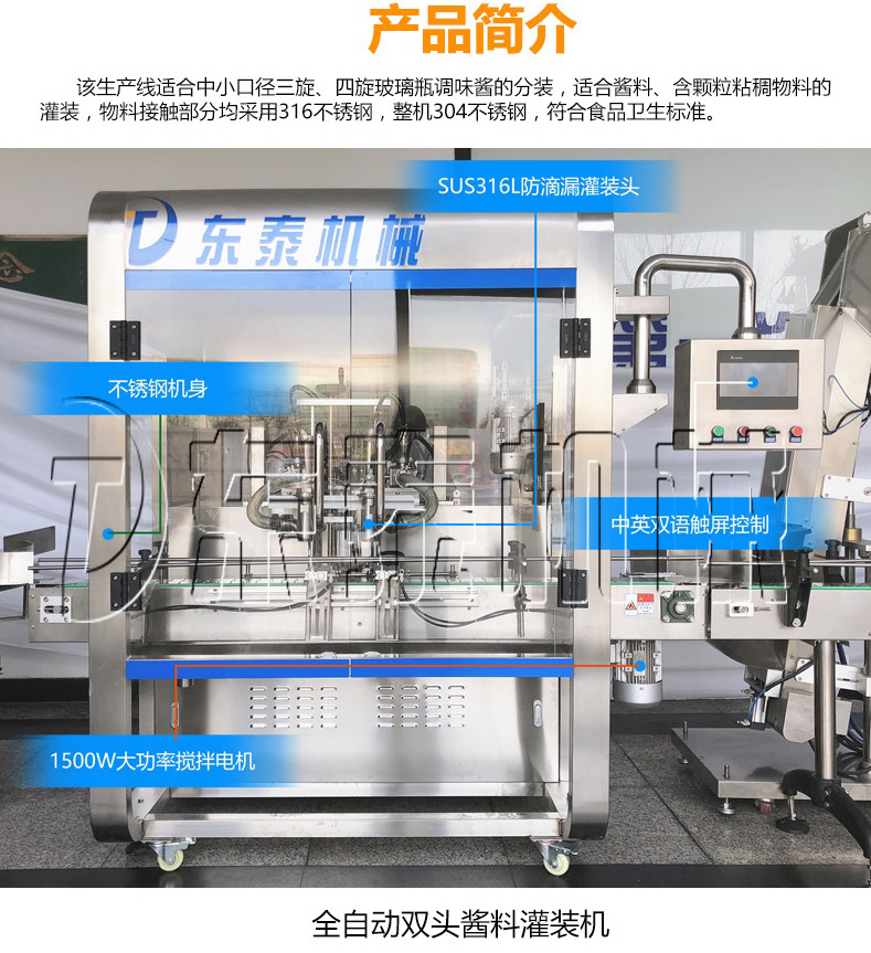 該機為全自動醬類灌裝機,配有自動攪拌功能,使物料混合更加均勻 ,有效的解決灌裝誤差大的問題;本機輔料添加料可調(diào),精準(zhǔn)方便,提高自動化程度。 醬類灌裝機氣動部分均采用氣動元件,壽命長,穩(wěn)定。 物料接觸部分采用SUS316L不銹鋼材料制成,符合食品醫(yī)藥安全衛(wèi)生要求。 灌裝閥由氣動閥控制,灌裝精度更高。 灌裝量和灌裝速度均可任意調(diào)節(jié)。 灌裝頭是我公司創(chuàng)新的灌嘴,可有效解決拉絲、滴漏問題. 該醬類灌裝機大小瓶調(diào)節(jié)方便,配置自動升降裝置。 采用集成理念設(shè)計,易損件少,方便企業(yè)維護保養(yǎng)。 該全自動醬類灌裝機設(shè)有無瓶不灌裝功能,不需更換零件,即可快速調(diào)整各種不同形狀規(guī)格的瓶子。